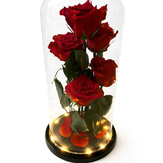 Öt óriás örökrózsa üvegbúrában, LED világítással