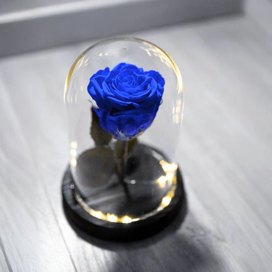 L-es fejméretű szálas kék örökrózsa üvegbúrában, LED világítással