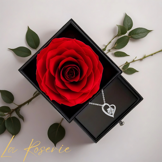 Vörös örökrózsa nyaklánccal, ajándéktáskával