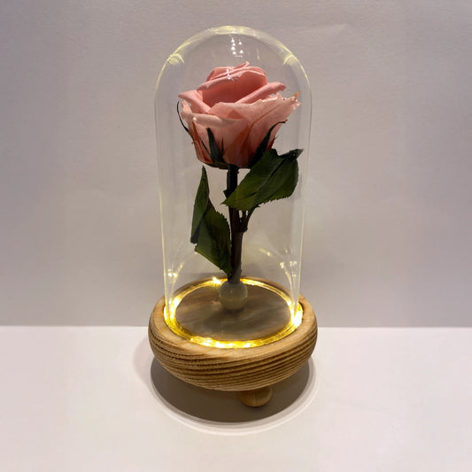 S-es szálas rózsaszín örökrózsa üvegbúrában, LED világítással