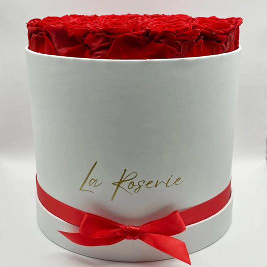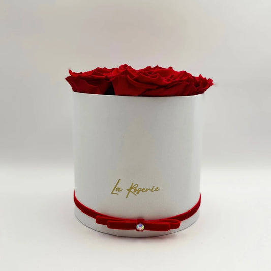 Vörös örökrózsa fehér kalapdobozban