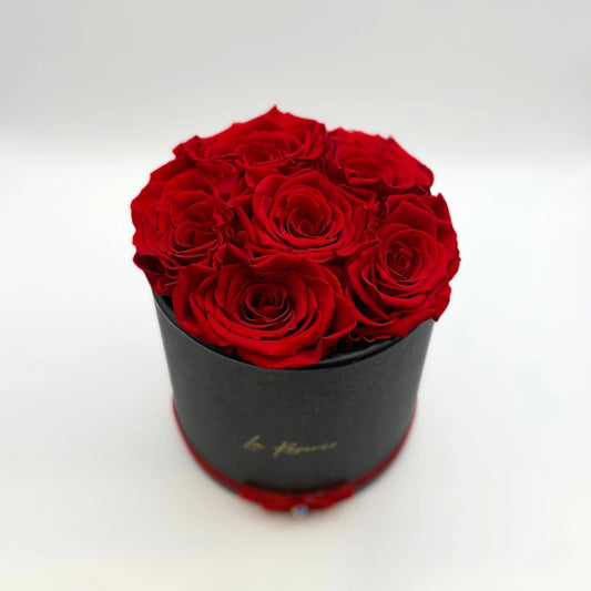 6 szál vörös örökrózsa fekete kalapdobozban