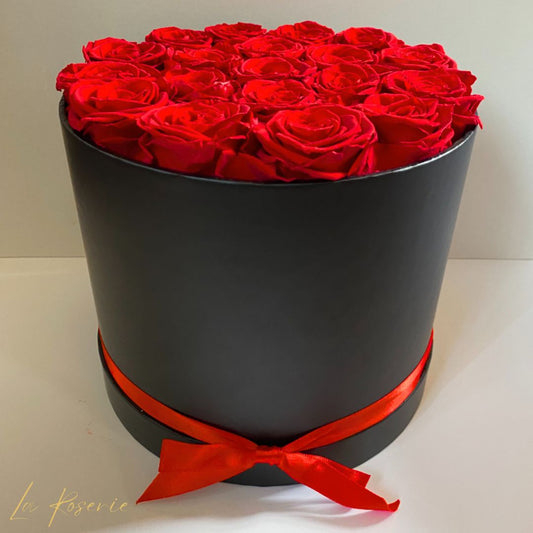 18-20 szál vörös örökrózsa fekete kalapdobozban