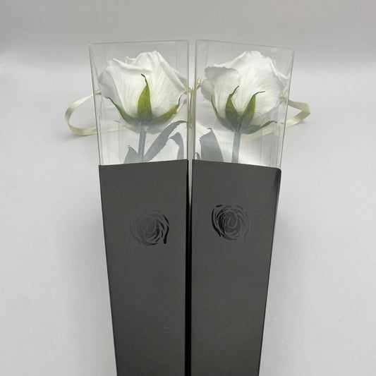 Fehér örökrózsa fekete kalapdobozban