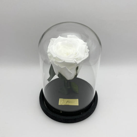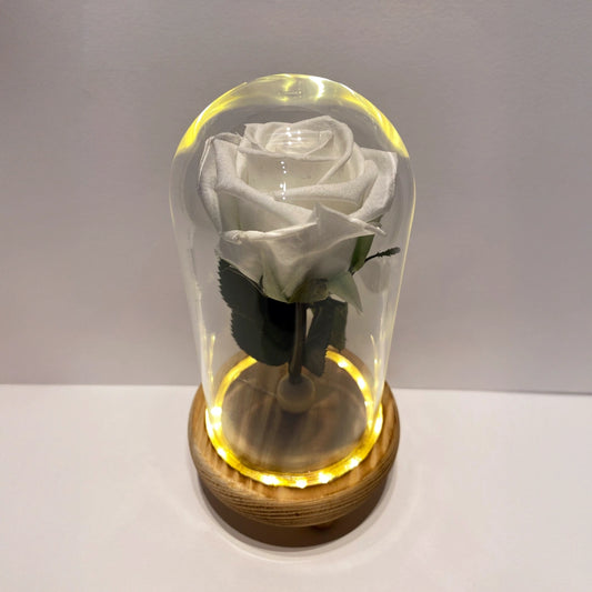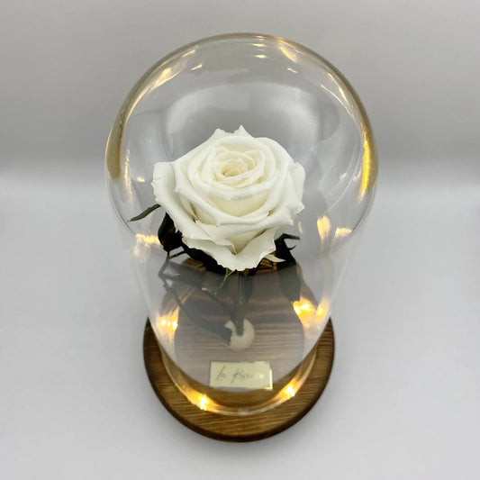 S-es szálas fehér örökrózsa üvegbúrában, LED világítással