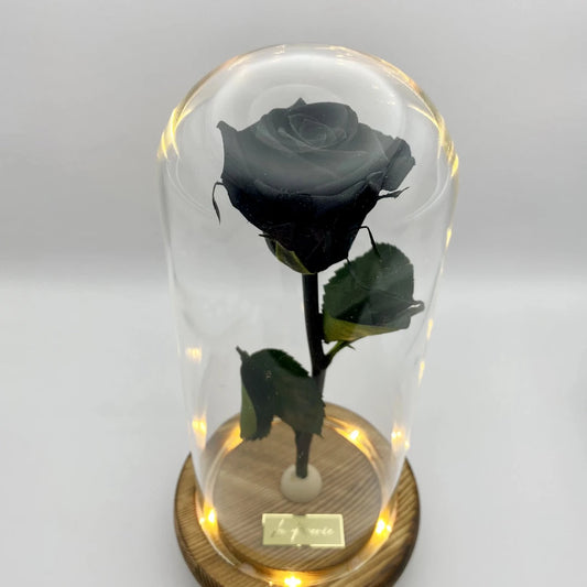 M-es fejméretű szálas fekete örökrózsa üvegbúrában, LED világítással
