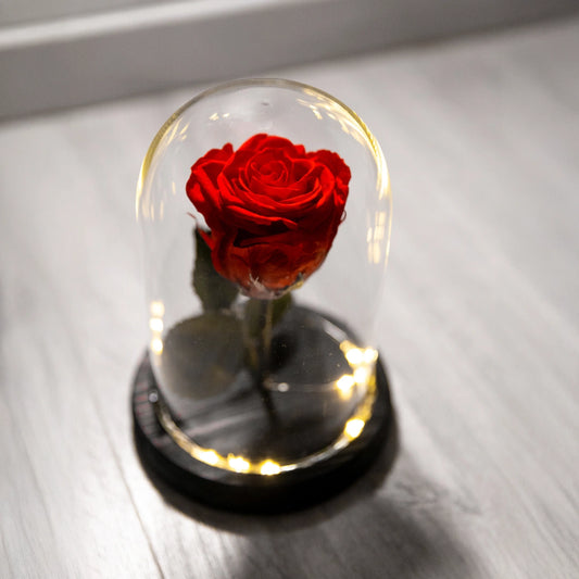 Örökrózsa üvegbúrában, LED világítással, "Szeretlek" felirattal