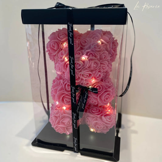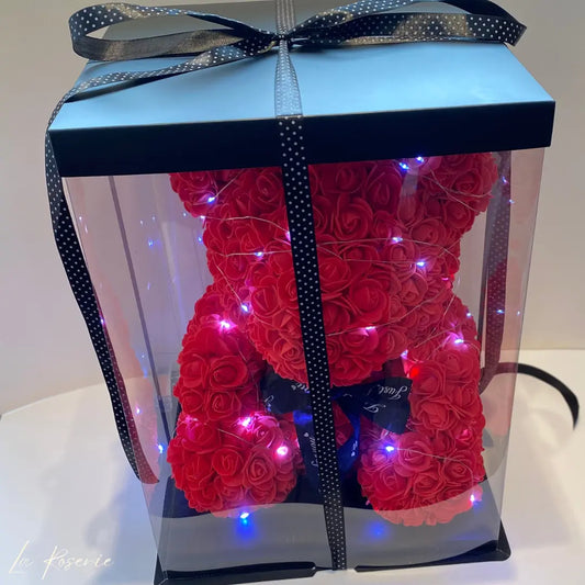 Rózsa maci LED világítással, díszdobozban - 25 cm