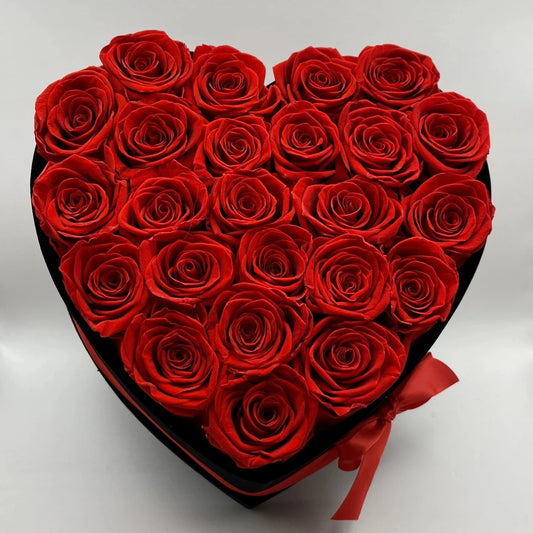 24 szál vörös örökrózsa fekete bársony szív dobozban