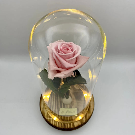S-es szálas rózsaszín örökrózsa üvegbúrában, LED világítással