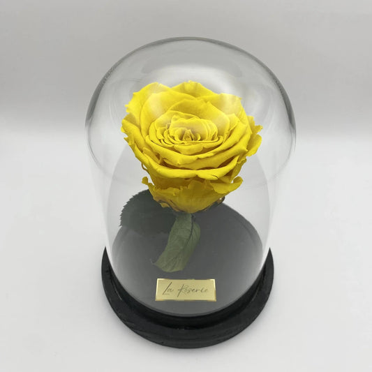 L-es fejméretű szálas sárga örökrózsa üvegbúrában, LED világítással