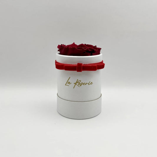 Mini szív alakú örökrózsa fehér kalapdobozban